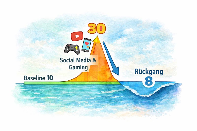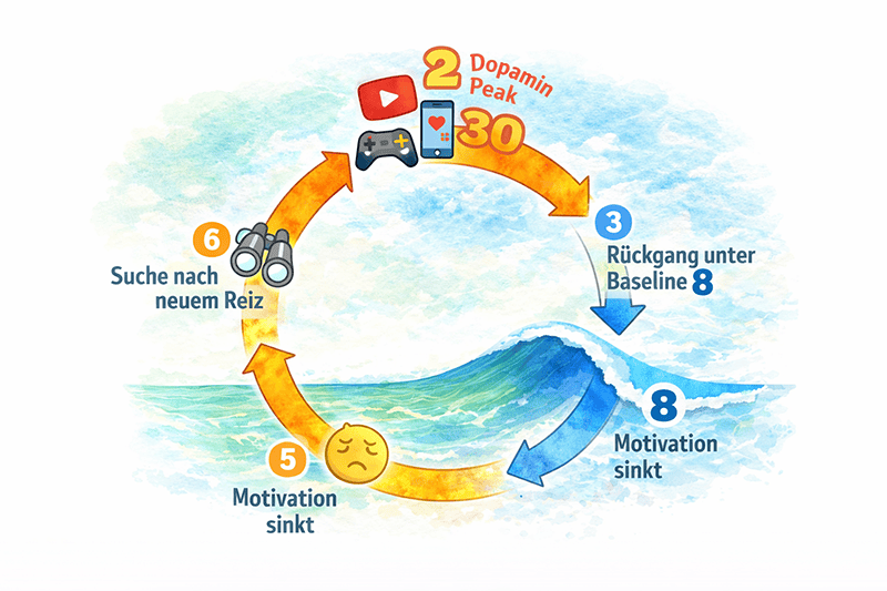Social Media erzeugt schnelle, intensive Dopaminanstiege. Nach diesen Peaks kann die Baseline kurzfristig sinken. Normale Aufgaben wie Lesen oder konzentriertes Arbeiten wirken dann weniger stimulierend. Das hat nichts mit fehlender Disziplin zu tun, sondern mit relativer Reizwahrnehmung im Gehirn.